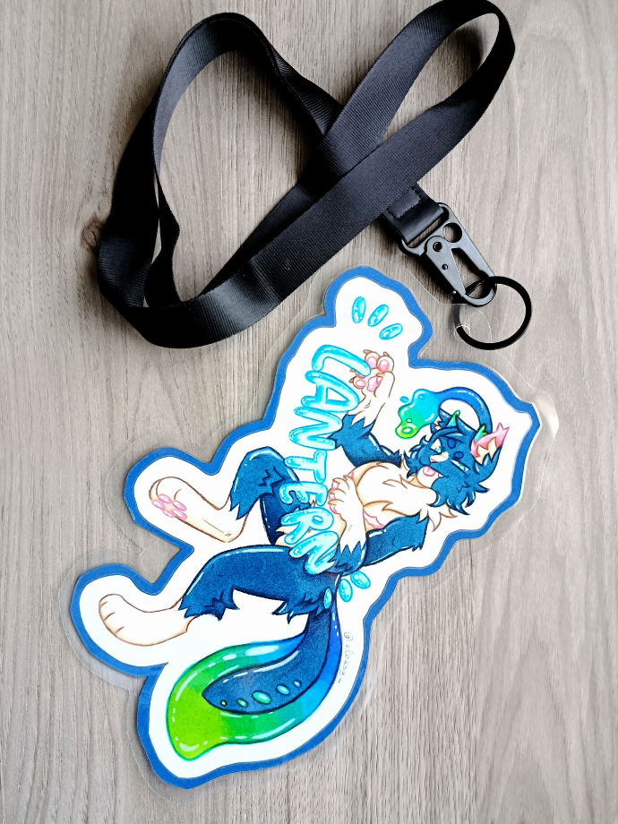 Illustration faite sur une seule face de la feuille, aux feutres à alcool et crayons de couleurs, envoyée plastifiée et avec un tour de cou. Le dos du badge peut être un papier de la couleur de votre choix, avec ou sans motifs. Le format de base est sur feuille A5 (soit un badge de 21cm de haut).